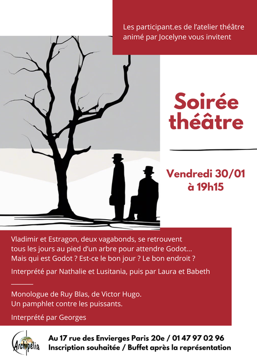 Soirée théâtre avec le groupe amateur animé par notre bénévole Jocelyne : rdv le 30 janvier !